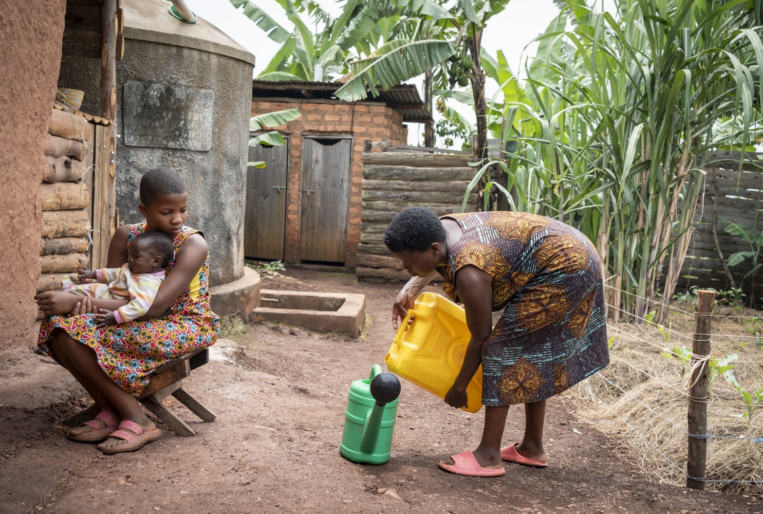Weil sie gerade Schulferien haben, sind neben Immaculate auch der 10-jährige Davis und die dreijährige Sheeran, die bereits in die Vorschule geht, zu Hause geblieben. Sie helfen ihrer Mutter bei der Arbeit oder tragen den kleinen Levison herum, damit die anderen die Hände frei haben. Während ihre Tochter Immaculate sich an das Waschen der Wäsche macht, beginnt Joy Kamusiime mit dem Gießen des Gemüsebeetes. Sie hat ihre Beete säuberlich eingezäunt, die Erde außerdem mit Stroh bedeckt – so bleibt die Feuchtigkeit länger in der Erde. Auch diesen Tipp hat sie von ACORD bekommen, zusammen mit anderen Vorschlägen dazu, wie sie ihre Garten- und Feldarbeit an den Klimawandel anpassen kann. Joy Kamusiime scheint alles aufzusaugen und umzusetzen, was sie an Anregungen bekommt. So hat sie ihre Rote Beete, den Kohl, Spinat, Karotten und Zwiebeln zwischen die Bananen, den Mais und Zuckerrohr gepflanzt, damit die hohen Pflanzen den niedrigen Schatten spenden. Und weil ihr Grundstück klein ist, zieht sie zusätzlich Gemüse in Säcken.