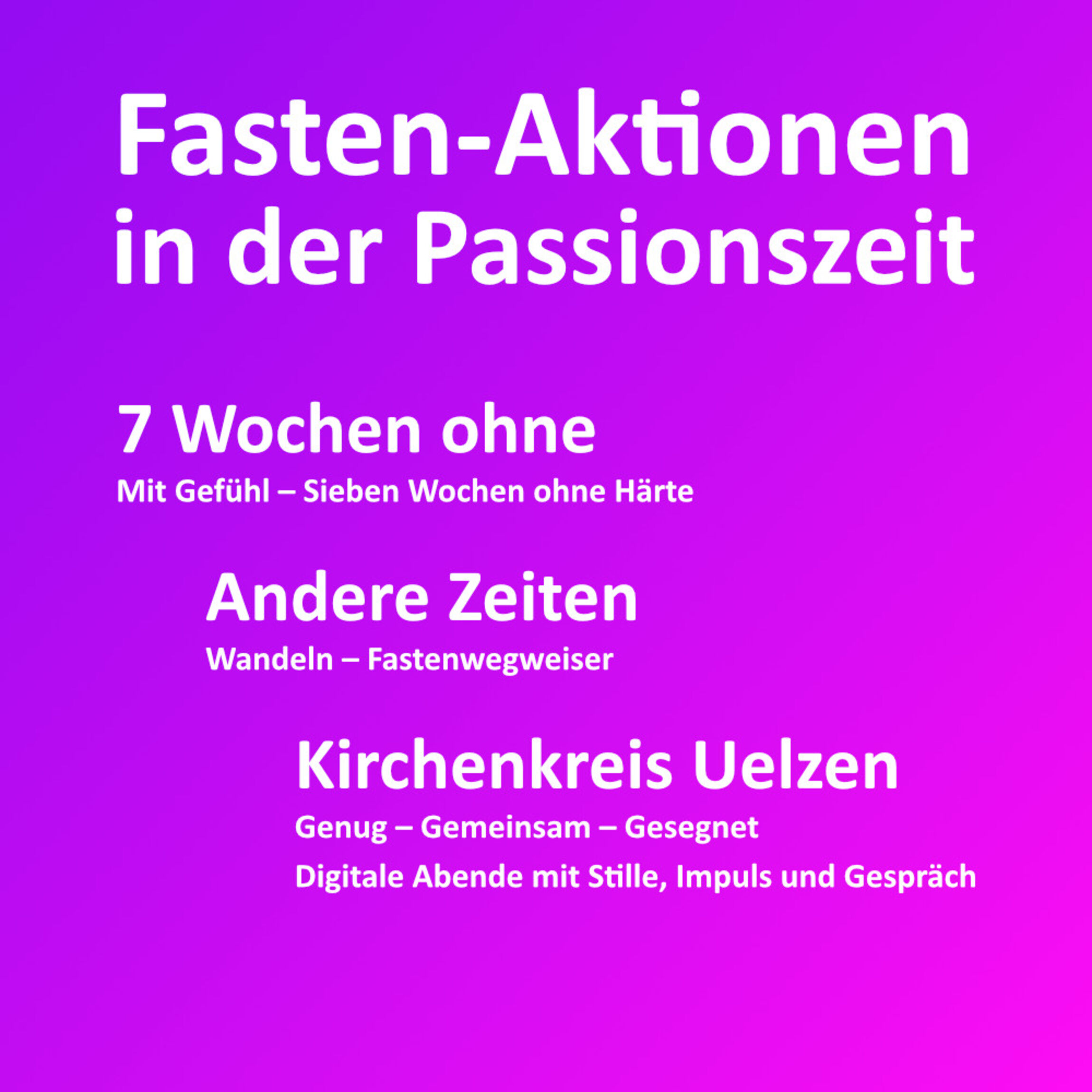 Eine lange Tradition hat zum Beispiel die seit 1983 bestehenden Fastenaktion „7 Wochen ohne“ der Evangelischen Kirche. In diesem Jahr beginnt sie am 18. Februar und steht unter dem Motto „Mit Gefühl! Sieben Wochen ohne Härte“.