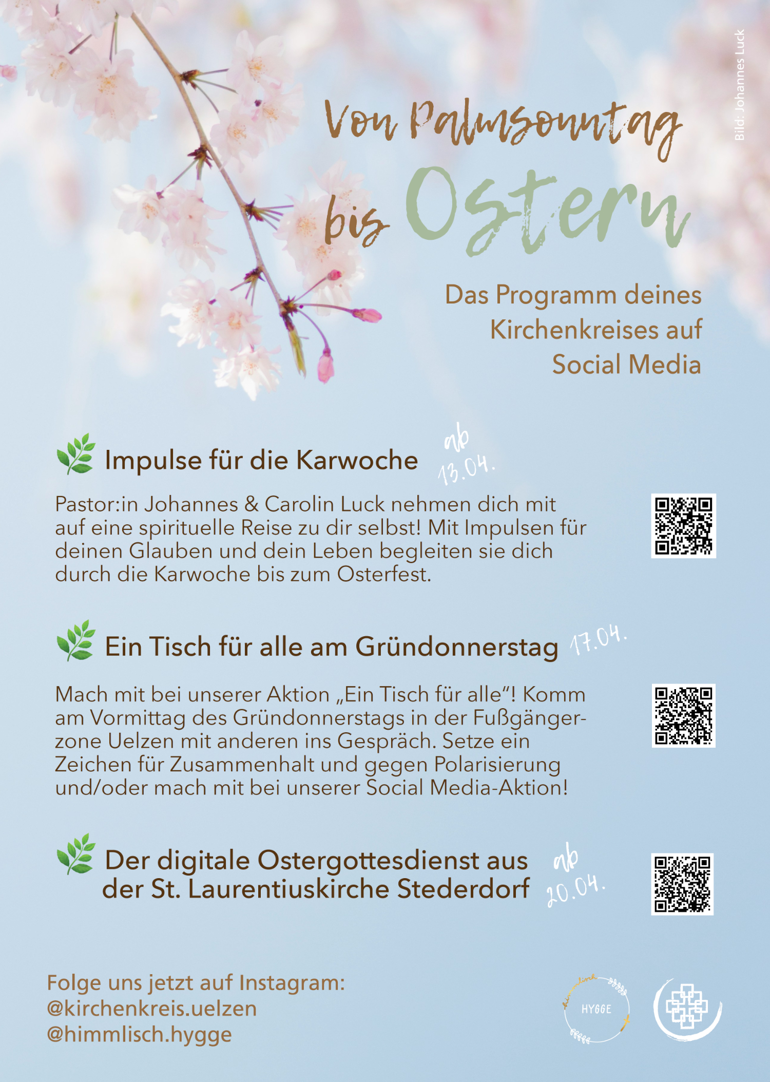 Von Palmsonntag (13. April) bis zum Osterfest (20./21. April) ist der Kirchenkreis Uelzen wieder mit besonderen Aktionen in seinen Social-Media-Kanälen vertreten.
