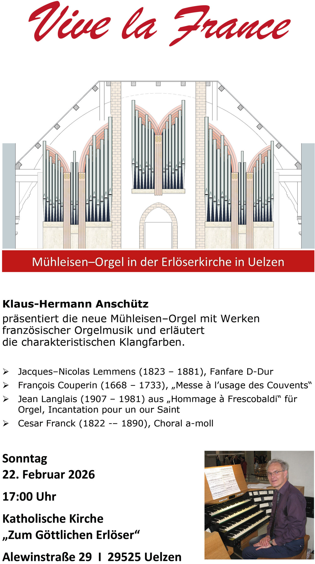 Am Sonntag, 22. Februar, findet um 17 Uhr in der katholischen Kirche „Zum göttlichen Erlöser“ in Uelzen das erste Orgelkonzert nach der kürzlich erfolgten Weihe der neuen Mühleisen-Orgel statt.