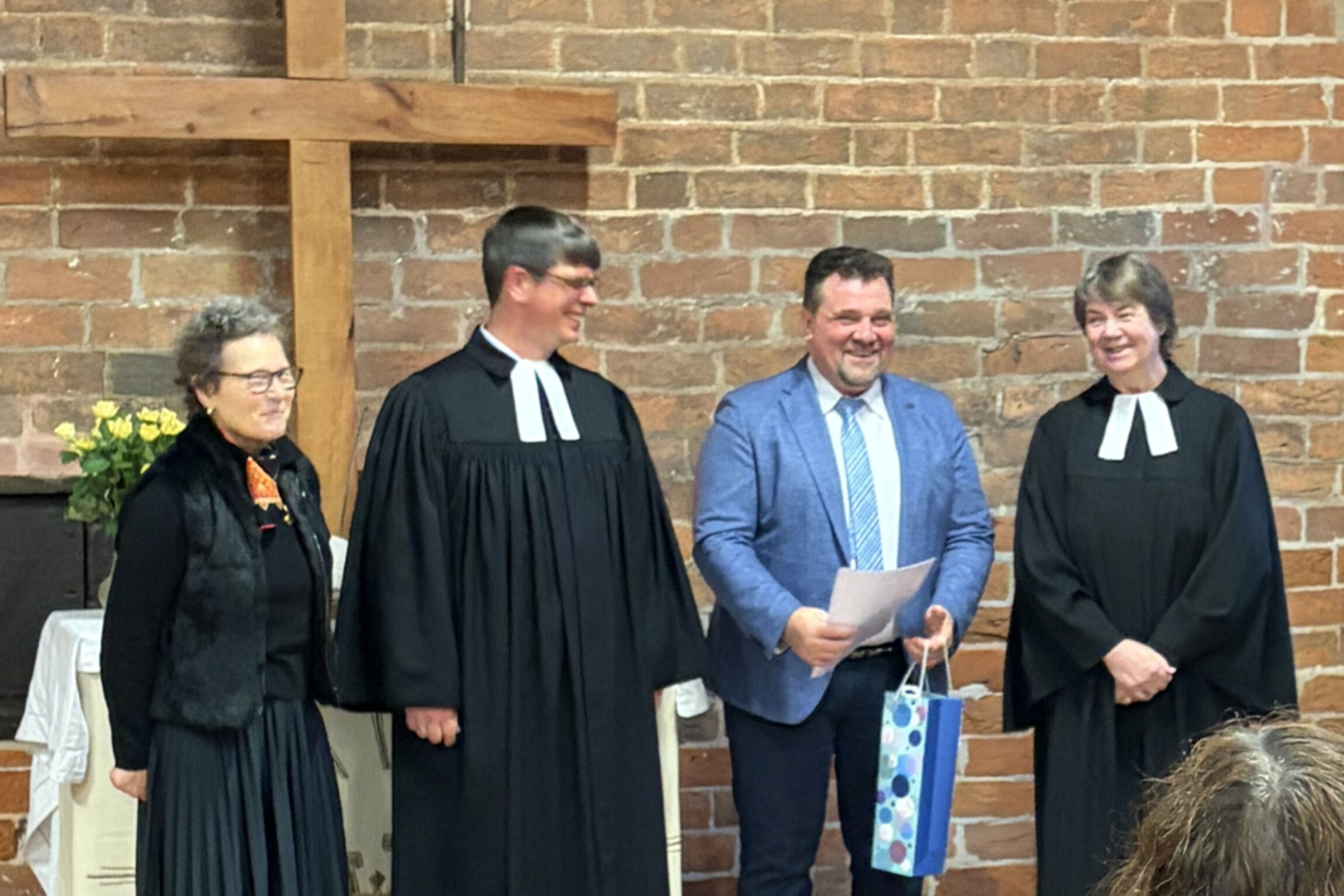 Eine weitere Besonderheit an diesem Nachmittag war die Ehrung des Küsters. Vitalij Kesner, der am 1. Dezember 2005 seinen Dienst begonnen hatte, wurde für 20-jähriges Engagement mit Herz für die Gemeinde gedankt. Er richtet das Gemeindehaus für die jeweiligen Anforderungen her, sorgt in der Kirche oder im Refektorium für Ordnung, arrangiert Blumen und Kerzen, räumt Schnee und mäht Rasen. Er hat für alle ein offenes Ohr und springt auch spontan ein, wie etwa bei einem Heizungsausfall im Gemeindehaus. Meist kann er helfen und dafür dankten ihm die Pastoren und die stellvertretende Vorsitzende des Kirchenvorstandes Christine Bruns auch mit einer Urkunde und einem kleinen Präsent und die Gemeinde mit langem Applaus.