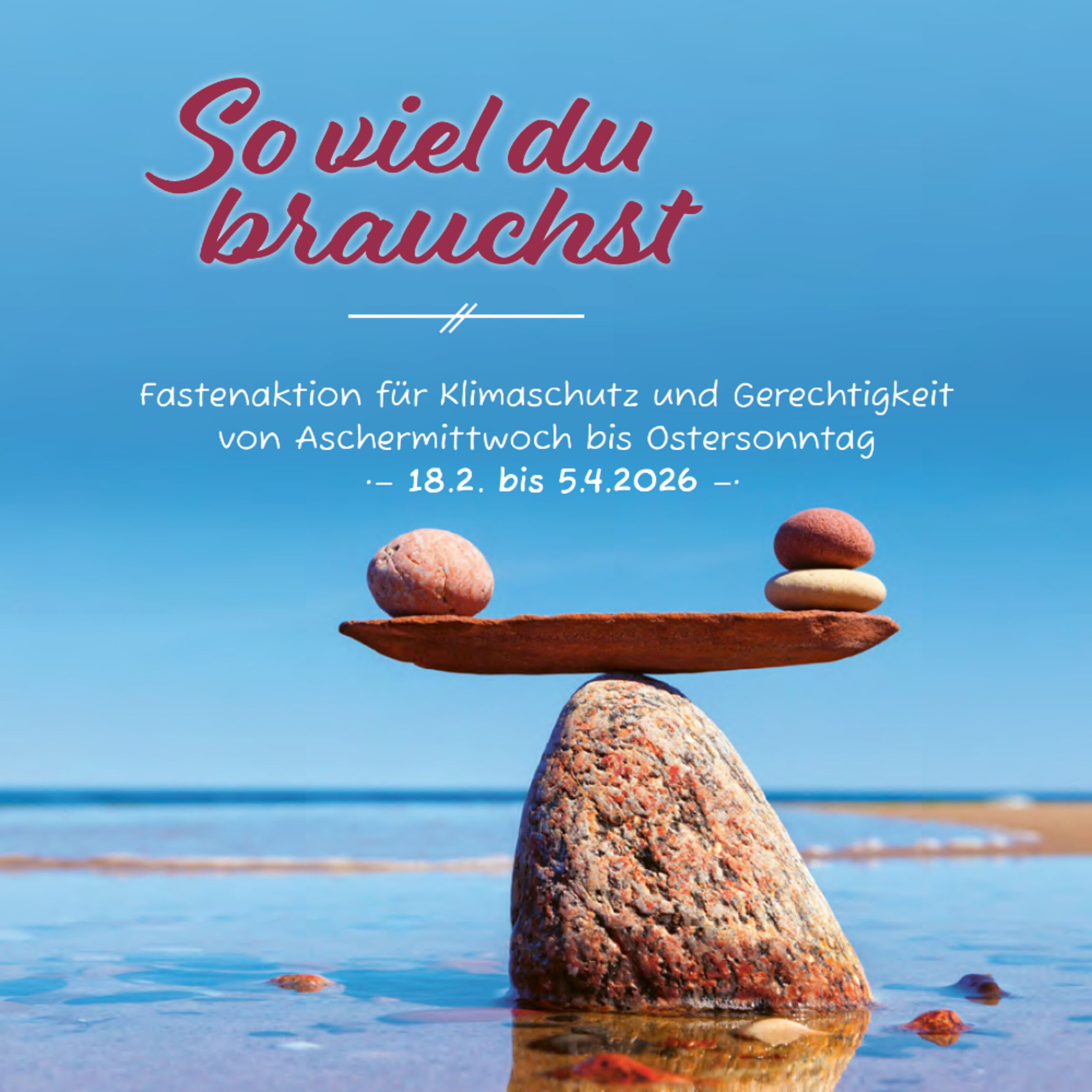 Auch 2026 lädt „Klimafasten“, eine kirchliche Initiative von 24 evangelischen und katholischen Partner:innen, zur Fastenaktion für Klimaschutz und Gerechtigkeit ein. In der Fastenzeit vom 18. Februar bis zum 5. April 2026 steht der Klimaschutz im Zentrum. Dieses Jahr steht die Aktion unter dem Motto „Wieviel ist genug?".