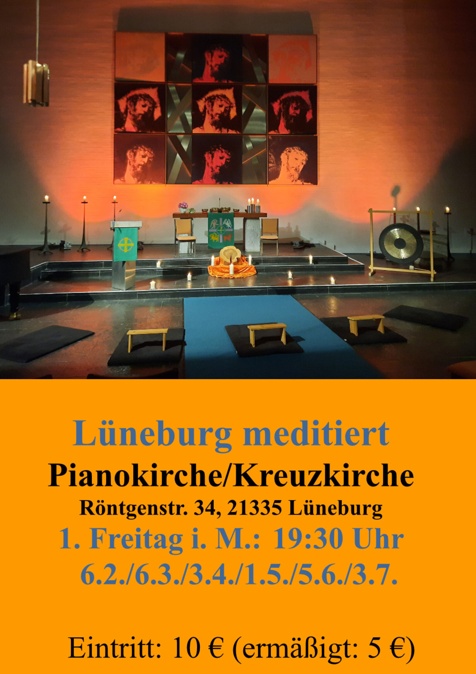 In der Kreuzkirche Lüneburg (Stadtrand Südost) entwickelt sich zurzeit eine „Kirche der Stille“, die mit ihren Angeboten für den Bereich Nordost-Niedersachsen da sein will. Ein jetzt schon bestehendes, überregionales Format ist dabei „Lüneburg meditiert“. Der Name ist Ausdruck dafür, dass nicht nur eine Kirchengemeinde Wege zur Stille in ihrem Einzugsbereich anbietet, sondern dass ganz Lüneburg und die Landregionen eingeladen sind. Und vom Gedanken der Zusammenarbeit der Kirchenkreise Uelzen, Lüchow-Dannenberg und Lüneburg, die kommen soll, wäre dieses Format etwas, das uns - wer mag - zusammenrufen könnte. Die Stillemomente, ein spiritueller Impuls, Gesang und Körperdehnungen tragen dazu bei, dass jede/r bei sich ankommen kann und Ruhe und Sammlung findet.