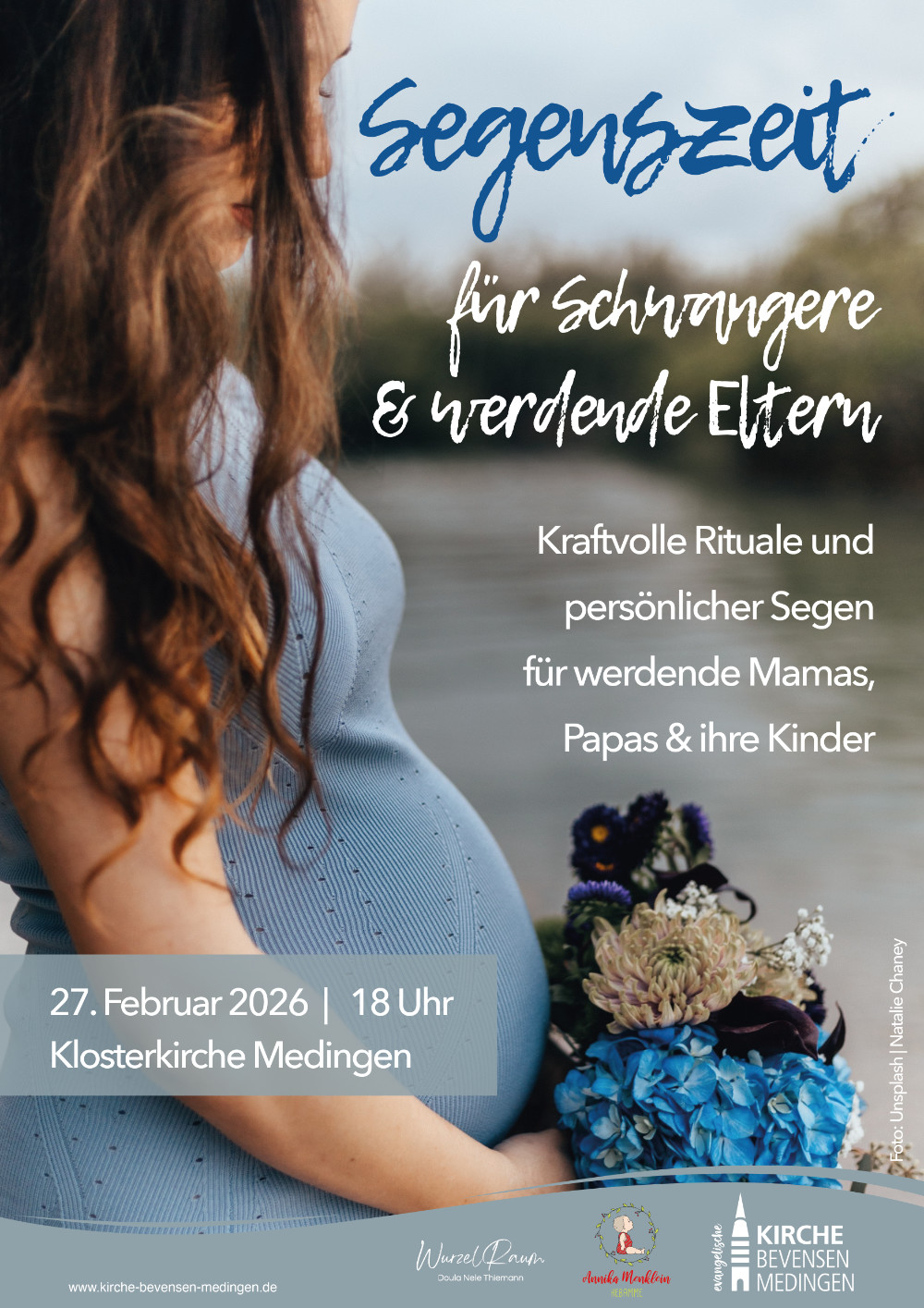 In der Segenszeit am Freitag, 27. Februar, um 18 Uhr in der Klosterkirche Medingen möchten wir werdenden Müttern, Vätern und Familien einen geschützten, stärkenden Raum anbieten – mit Musik, Meditation, persönlichen Segensmomenten und kreativen Stationen rund um Schwangerschaft, Geburt und neues Leben.