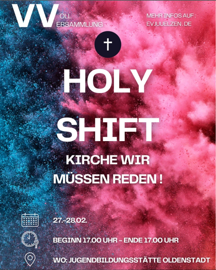 Die Vollversammlung findet mit freiwilliger Übernachtung in der Jugendbildungsstätte in Oldenstadt statt. Das Thema wird sein: „Holy Shift - Kirche, wir müssen reden!“ - Am Freitag ist Zeit zum Kennenlernen, Schnacken und Spielen. Am Samstag steigen wir in unser Thema ein und haben einen Sitzungsteil. Du kannst selber aussuchen, ob du beide Tage dabei sein möchtest oder nur am Samstag kommst.