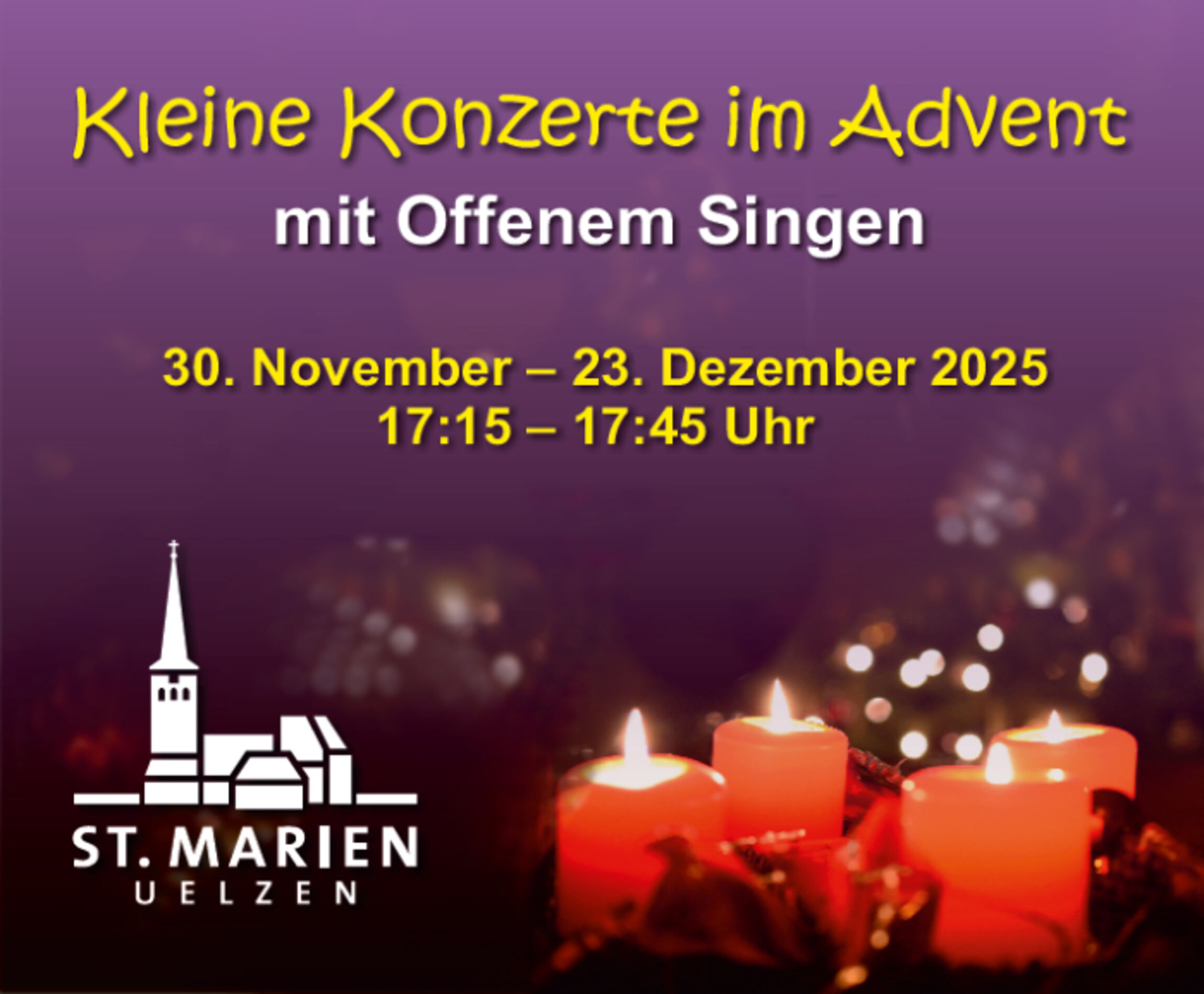 Am 1. Advent, Sonntag, 30. November, startet in der Uelzener St.-Marien-Kirche wieder die beliebte Reihe „Kleine Konzerte mit offenem Singen“. An jedem Abend im Advent musizieren jeweils von 17:15 Uhr bis 17:45 Uhr verschiedene Interpreten und Chöre oder Musikgruppen aus dem gesamten Landkreis Uelzen und laden die Besucherinnen und Besucher dabei auch zum Mitsingen bekannter Advents- und Weihnachtslieder ein.